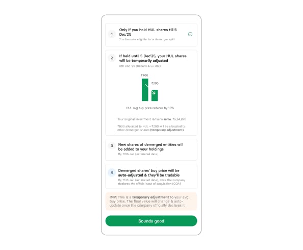 No more googling 'why did my share value drop' or ‘why demerger shares are not credited’. No more cross-checking multiple sources to figure out when your bonus shares will arrive. Everything you need is in one place, clearly explained.