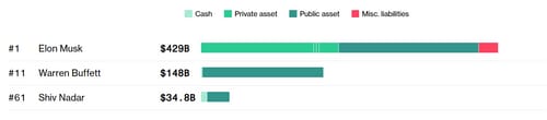 - Elon Musk: With a net worth of about $429 billion, his fortune is almost entirely tied up in private assets and public assets. On the cash side? Essentially nothing.