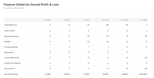On paper, this looks futuristic, ambitious, even exciting. But in practice, these initiatives remain early-stage. Very little of this vision has translated into steady, verifiable revenue yet. TGL is still a company selling a promise, not a completed product. Here’s a look at Treasure Global’s financials: